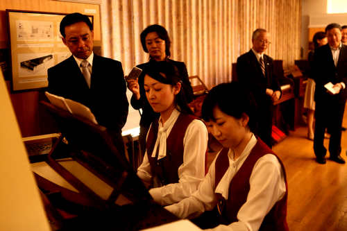 在圓滿完成了日本福岡(gang) 、北九州和廣島三市6場演出之後,全團於(yu) 5月13日來到了東(dong) 京。團員們(men) 首先拜訪了日本民主音樂(le) 協會(hui) 總部並進行了參觀,為(wei) 紀念梅蘭(lan) 芳大師誕辰一百二十周年,日本民主音樂(le) 協會(hui) 舉(ju) 辦了梅蘭(lan) 芳藝術特展。藝術團一行還參觀了日本民主音樂(le) 協會(hui) 的音樂(le) 博物館暨鋼琴博物館。